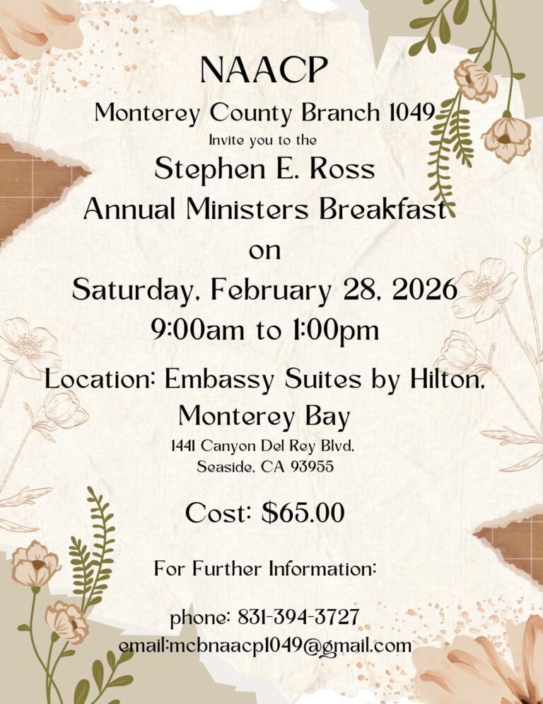 2026 Ministers/Stephen E. Ross Breakfast Everyone,Registration is required for an accurate food count.Each guest must fill out a separate form.Guests, please note that no payments will be accepted at the door.Contact Alicia Gaines with questions at alicia.gaines17@gmail.comThank you. Please enable JavaScript in your browser to complete this form.Name *FirstLast Name One Email *Select One *I am a minister and have completed my RSVP.I am a guest and will send a check for payment(s) by 2/26/26 to ensure arrival by 2/28/26 ($65 for each meal). Please include the names of all people in your party. Mailing address: NAACP, P.O. Box 782, Seaside CA 93955. Please includes the first and last names of all attendees.I am a guest and will pay online below before January 26th ($65). Please ask additional guests to register separately.Submit