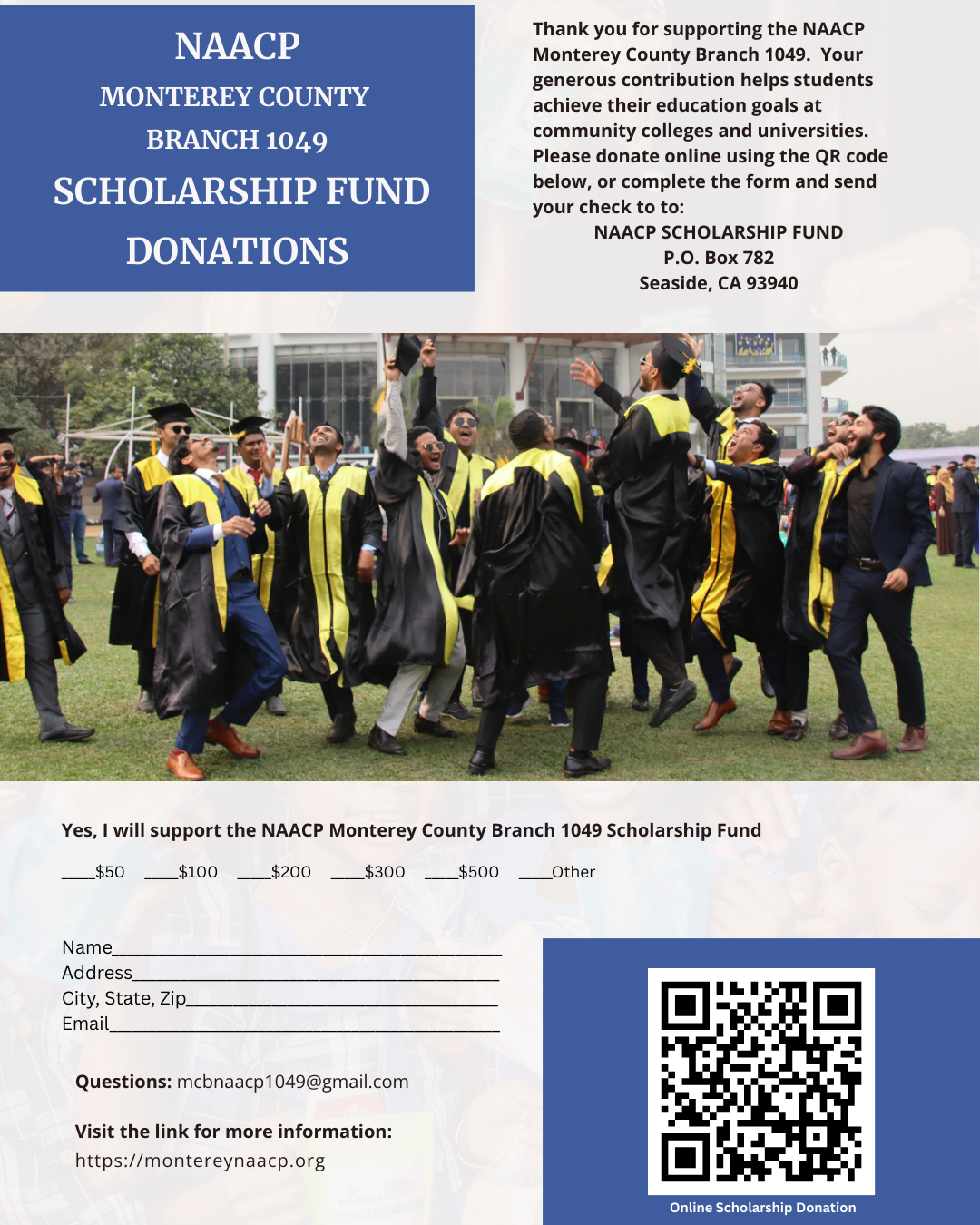 Alternatively, make your check out to the Monterey County Branch NAACP and send it to P.O. Box 782, Seaside, CA 93955. In the lower-left area of your check, please indicate which fund you want to donate to.